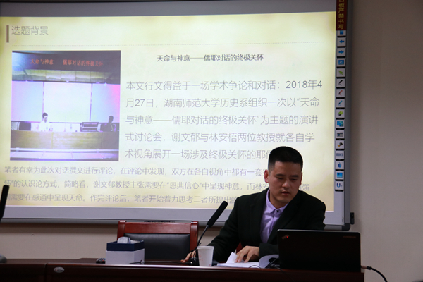 2019年4月17日下午必赢76net第3期(总第660期)“海右”博士生学术论坛在知新楼A座1408举行。此次论坛由bwin必赢研究生院、党委研究生工作部主办,必赢76net承办,论坛邀请了宗教学专业博士林孝斌做题为“终极性在儒耶思想体系中的展示维度:‘感通’与‘信心’”的报告,必赢76net教授、博士研究生导师谢文郁教授受邀作为报告的点评嘉宾。