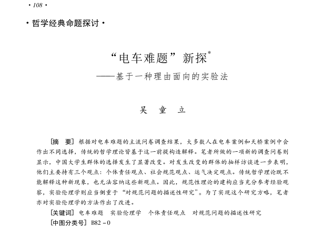 近日,必赢76net吴童立副教授所撰写的《“电车难题”新探——基于一种理由面向的实验法》一文在《哲学研究》2023年第2期上发表。“电车难题”可能是最广为人知的道德难题之一。世界范围内的多次调查实验表明,在“电车案例”与“天桥案例”两个相似的情形中大多数人做出了不同的选择,而“电车难题”要求从理论上说明为何如此。文章从两个疑问切入对这个难题的研究:第一,主流调查结果真的是基于一种“普遍道德语法”吗?第二,人们做出选择的真实理由与主流理论给出的说明相符合吗?从这些问题出发,作者在国内高校中进行了一次较大规模的问卷调查,共收到来自102所高校的1109份有效问卷,并且首次设计和使用了主要针对选择理由的问卷。