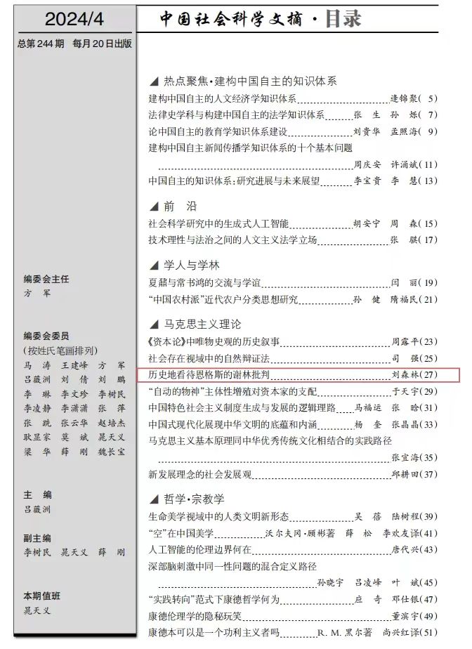 近日,刘森林教授的文章《历史地看待恩格斯的谢林批判》(原载《马克思主义与现实》2023年第6期),被《中国社会科学文摘》2024年第4期主体转载。