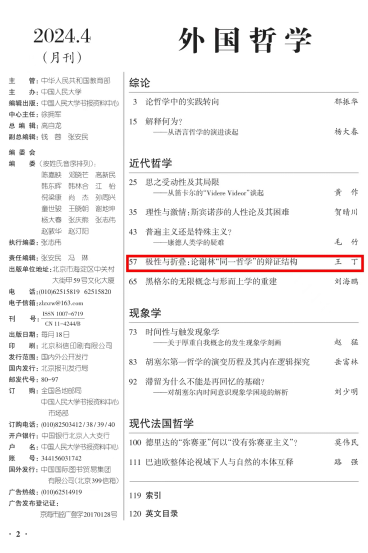 近日,必赢76net、中国诠释学研究中心王丁教授的文章《极性与折叠:论谢林‘同一哲学’的辩证结构》,被人大复印报刊资料《外国哲学》2024年第4期全文转载。该文原载于《中山大学学报》(社会科学版)2024年第1期,系国家社会科学基金青年项目“谢林晚期哲学体系的双重视角重建及其影响史研究”成果。